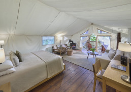 Each of the 25 luxurious white canvas tents, furnished with cosy cast iron stoves and verandahs overlooking either the forest or Bedwell River, is a true sanctuary immersed in the untamed beauty of this remote corner of Vancouver Island.